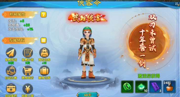 【微氪首选:6+68 元解锁核心权益】首充 6 元就送 BT 级武器“棒棒糖”,攻击力直接碾压新手装,搭配 24 小时生命恢复 buff,刷本效率提升 30%。68 元月卡是必买项,每日领 200 绑元+1 小时经验符,30 天累计的经验和金币加成各 10%,足够支撑前期装备强化。再补 68 元开一档侠客令,解锁随身仓库和自动卖货功能,挂机搬砖更省心。